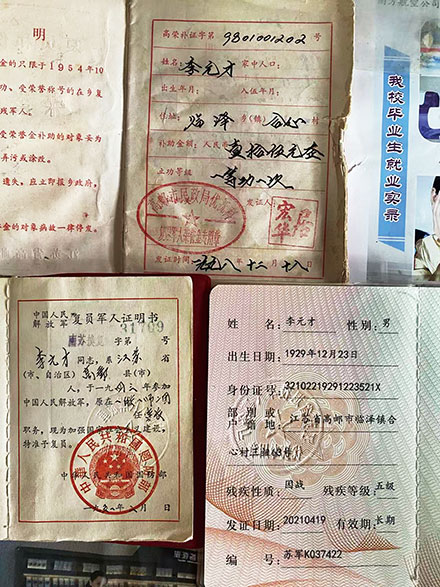 80多年过去了,李元才一直精心保存着那些有纪念意义的证书。在老人家中,记者看到了由国防部颁发的中国人民解放军复员军人证明书。翻开红色的扉页,“李元才同志于 1943 年参加中国人民解放军,原在一纵一师二团任连长职务”等字样清晰可见,仿佛在诉说着那段激情燃烧的岁月。还有由市民政局颁发的复员和伤残军人荣誉金证,上面记录着一等功的立功等级。因岁月侵蚀而破损的证书,却是老人一生的荣耀。李元才谦虚地说:“我不算什么英雄,国难当头,我只是尽了一名军人应尽的义务,做了自己该做的事。比起那些牺牲的战友,我已经无比幸运了。”