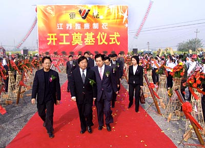 开工现场,彩球高悬,龙狮劲舞,鼓乐喧天,人头攒动,大家都在为高邮服装业的又一盛事而欢欣鼓舞。副市长王东升和雅鹿集团董事长兼总裁顾振华分别发表了热情洋溢的欢迎辞。