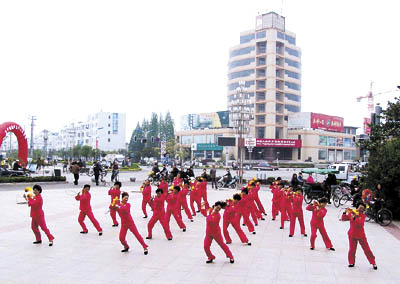 五一前夕 ,市总工会组织市老年业余健身队的几十名队员(年龄最大的已经70岁),集中排练“健身双球操”,以参加由扬州市总工会举办的健身操表演赛,展示高邮老年人的新风采,。图为老年业余健身队正在高邮大剧院广场前排练。