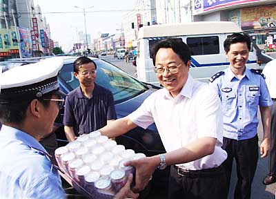 8月1日上午,市领导冒着高温组团慰问了驻邮部队官兵及交巡警,为他们送去了丝丝清凉。
