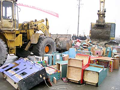 8日上午,在市开发区凌波路,约500台赌博游戏机被集中销毁。此次活动是今年我市第二次集中销毁赌博游戏机专项行动。市委常委、市公安局长沈兴华参加活动。