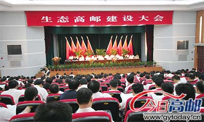 市委书记陈扬在会上指出,大力倡导生态文明,加快建设生态高邮,是我市全面贯彻落实科学发展观、构建社会主义和谐社会的必然要求,也是我市实施新一轮追赶跨越发展战略、建设更高水平全面小康新高邮,全面提升综合实力和竞争力的战略举措。全市上下要充分认识:加快生态高邮建设是人类社会文明进步的必然要求,是全面贯彻落实科学发展观的具体体现,是“全面达小康、建设新高邮”的题中应有之义,是提升县域经济竞争力的重要途径。