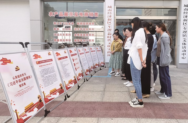 27日下午,城南新区新时代文明实践所启动《习近平谈治国理政》第四卷流动宣讲活动,通过8块流动展牌,从7个方面阐述了《习近平谈治国理政》第四卷的重点内容、重大历史性意义。下一步,该区将不定期送宣讲到各村(社区)。图为活动现场。