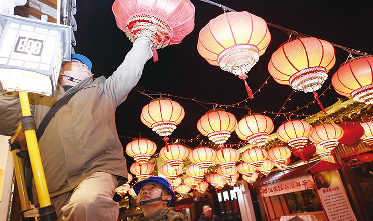 8日, 市供电公司组织员工前往盂城驿景区维护景观灯,保障元宵节期间古驿站安全用电,方便游人观赏夜景。图为维护现场。