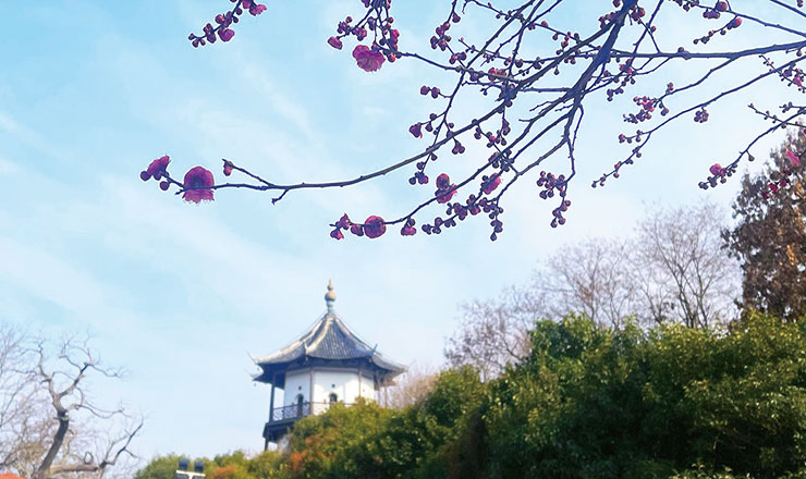 早春时节,随着气温逐步回暖,我市各地梅花相继绽放,市民迎来赏梅黄金期。 图为蝶园广场盛开的红梅与古奎楼相得益彰,为市民和游客提供了踏春休闲的好去处。
