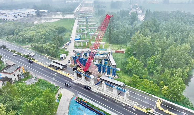 近日,宁盐高速扬州段高邮城南新区互通主线桥首节钢箱梁顺利安装。这标志着该项目桥梁建设取得重大进展,正式进入钢箱梁安装施工阶段。宁盐高速城南互通上跨G233,主线桥钢箱梁共48节,采用单箱三室截面结构。据了解,此次安装的首节钢箱梁长19.5米、重约28吨,安装高度7.5米。图为安装场景。
