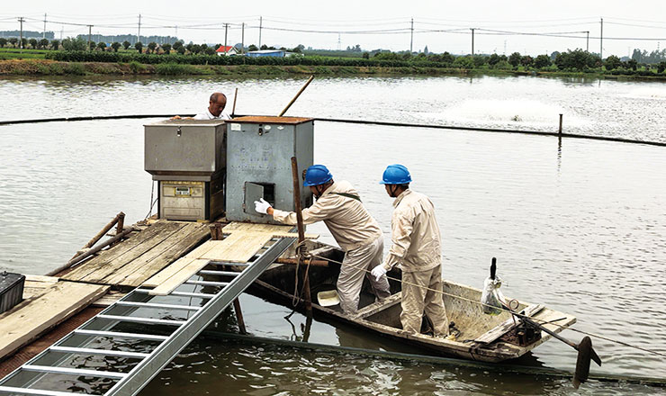 近日,我市出现阴雨低气压天气,水产养殖户纷纷启用增氧、投料设备。市供电公司组织工作人员到塘口走访服务,保障可靠用电。图为甘垛供电所员工在横铁村一黄颡鱼塘口维护电力投料机。