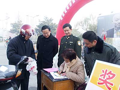 市运管部门在城区一些主要道口设立摩托车养路费征收点,极大地方便了市民缴纳养路费。图为征收养路费现场。