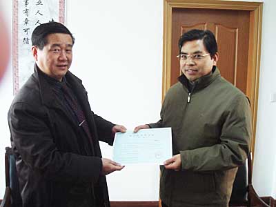 经过一段时间的调查摸底和检测评估后,我市内河港口经营许可证发放工作已于近日启动。图为市交通局有关负责人将我市第一本《港口经营许可证》交到市华泰物资交易有限公司的有关负责人手中。