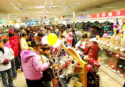 元旦期间,市区各大商场生意一片红火。在各种促销活动的推动下, 家电、服装、鞋帽等商品成了最引人注目的抢手货。不少销售现场出现了竞相抢购、人头攒动的情景。图为记者在人民商城鞋帽柜前摄下的一个镜头。 陆学智/摄