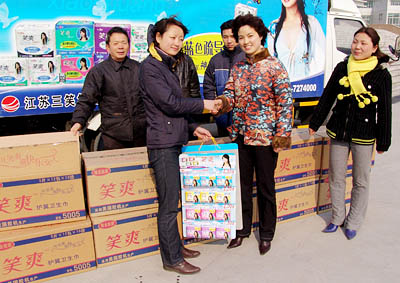 3月4日下午,江苏三笑集团在市政府行政中心广场,专门向我市下岗女工赠送了价值2550元的妇女卫生用品,以表达他们对下岗女工的关爱和问候。图为市妇联主席胡朝霞与三笑集团扬泰市场部负责人正在交接赠品。 陆学智/摄