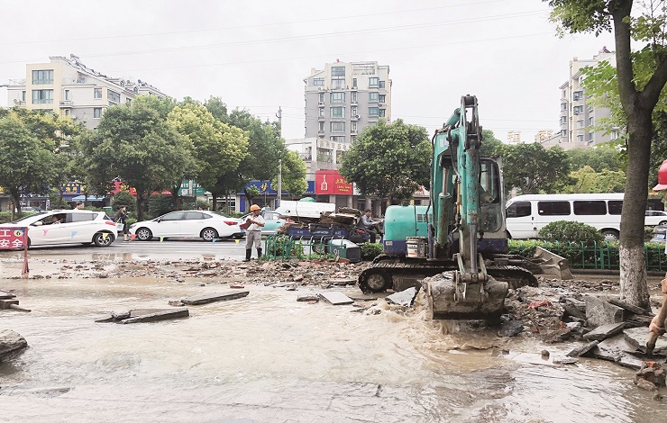 事发后,市港邮供水公司立即组织人员赶到现场,迅速关闭供水阀门,开展紧急抢修。在现场记者看到,20多名工人正在施工,破损路面旁放置了“前方施工,减速慢行”的警示牌,并拉上警戒线,提醒路过行人车辆绕行通过。“我们调来了一辆小型挖掘机,等待水压稳定后进行路面开挖作业。”抢修队队员顾学凤告诉记者,他们对破损路面进行开挖,并组织工人维修更换水管并恢复路面,对支管道同步进行维修。