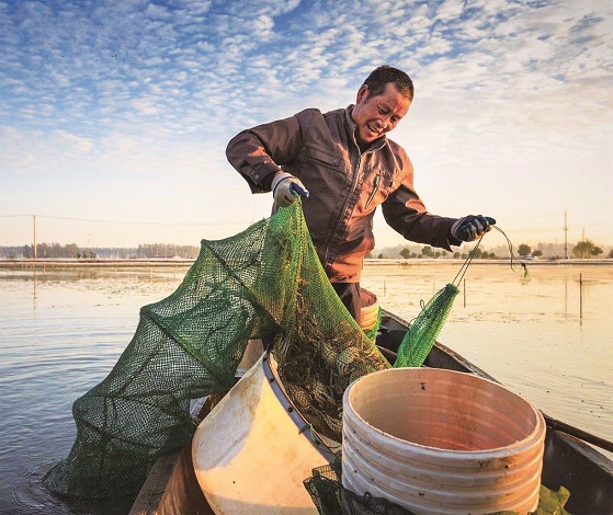 秋风起,蟹脚痒。连日来,我市高邮湖大闸蟹抢“鲜”上市,即将迎来销售旺季。作为国家地理标志产品,高邮湖大闸蟹凭借其营养丰富、肉质鲜美等特点受到人们的青睐,成为餐桌上的一道时鲜美味。图为“王鲜记”工作人员用蟹篓收蟹。 文正 摄