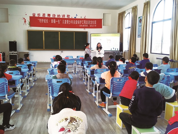 11日下午,龙虬镇妇联在龙虬小学举办了“守护成长· 幸福一生”儿童青少年关爱保护知识讲座,市儿童青少年保护志愿者讲师以《爱护我们的身体》为题,通过图文并茂的PPT、动漫视频、情景演练等形式,生动、形象地为孩子们讲述了如何保护身体、如何防范侵害等内容。图为讲座现场。 王素琴 孔令玲 摄影报道