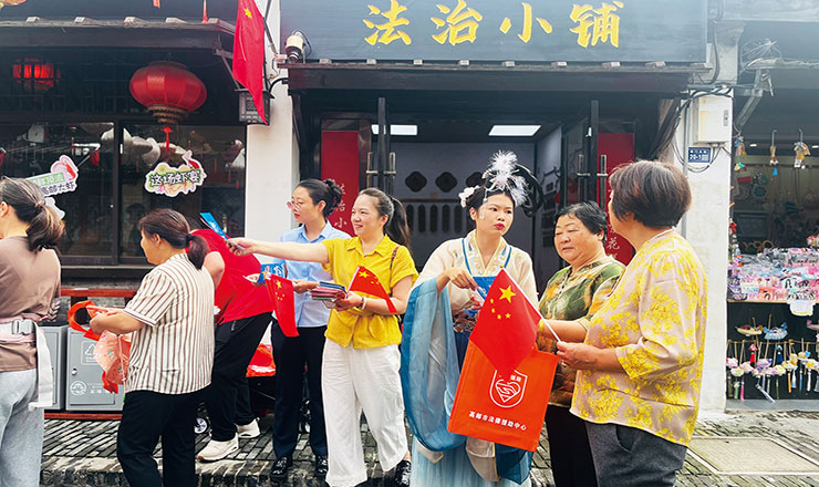 国庆假期,我市南门大街游人如织,一处由市司法局打造的“法治小铺”格外引人注目,“店小二”们大声吆喝,向过往游客普及法律知识,为节日增添了别样的法治温度。