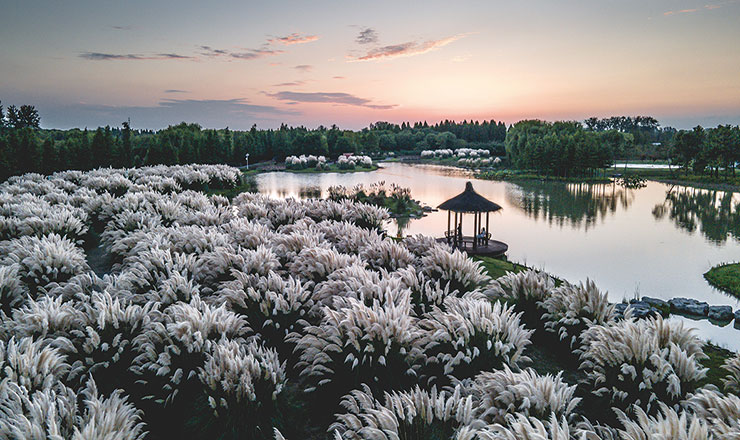珠湖小圳景区紧邻高邮湖而建,总占地面积达3000亩,不仅是国家3A级旅游景区,更是一处将自然野趣与人文底蕴深度融合的休闲旅游观光湿地。景区精心打造的“珠湖芦花观光基地”是其标志性景观。每到深秋,连片的芦花随风摇曳,成为无数游客心向往之的秋日打卡地。眼下正是这片芦花的最佳观赏期,景区内种植的草本植物矮蒲苇进入盛花期,硕大的花序如蓬松白雪,羽毛状的银白色花瓣在阳光下泛着柔和光泽,微风拂过便轻盈舞动,景致醉人,尽显这一著名观赏草本植物的独特魅力。