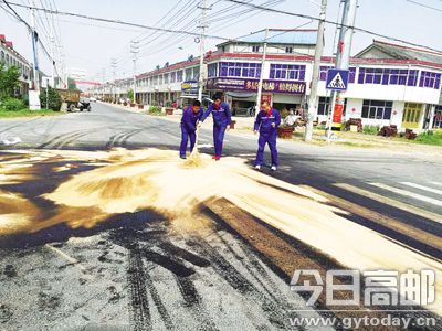7日上午9时许,在第八届环高邮湖自行车越野赛金湖补给站附近发生一起交通事故,一辆运送机油的三轮车与一辆小汽车发生碰撞,导致三轮车上的机油洒在赛道的路面上。此时,在该补给站为参赛人员发放矿泉水的中石化扬州高邮公司的工作人员立即启动应急预案,迅速使用黄沙对路面进行清理,确保了比赛的正常进行。 秦云 王小敏 摄影报道