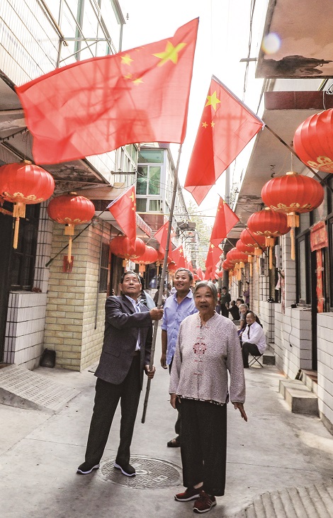 国庆节即将来临,高邮镇奎楼社区太平庄居民们不约而同地更换了家门口的国旗。一面面崭新的五星红旗迎风飘扬,与搭建在巷头的喜庆松门一起,扮靓了太平庄的街头巷尾,汇成了一道独特亮丽的风景线。