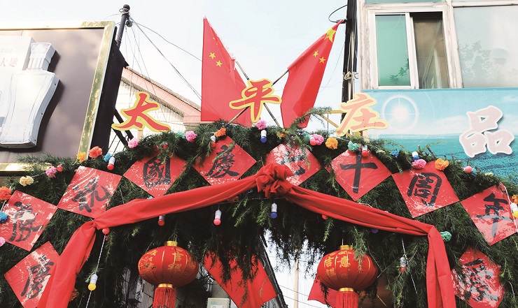 在现场,记者看见,位于太平庄东街入口处的喜庆松门上写着“庆国庆听党话、爱祖国感党恩”大字,松门周边装上彩色纸花、彩色灯泡,顶上插着小红旗。一旁的桌子上摆放着居民集体购买的寿桃,寿桃上绘着“国庆、70”的字样,格外醒目。而家家户户门口悬挂着的红灯笼、随风飘扬的五星红旗更让整个太平庄喜气洋洋。孩子们欢快地在国旗下奔跑,大人们挥舞着手中的红旗,共唱《我和我的祖国》。忆往昔,话今朝,大家脸上都笑开了花。
