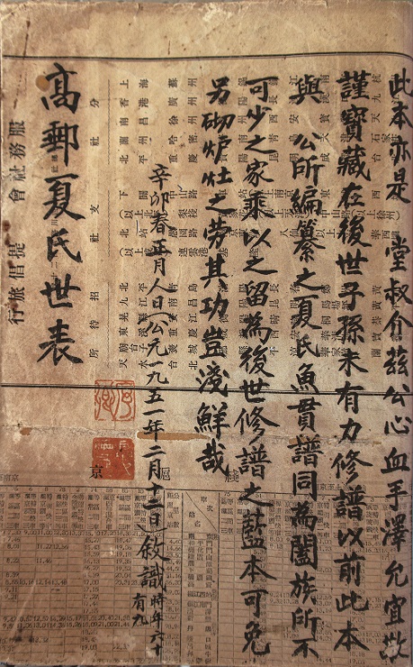 此谱为夏倫彝(1883-1967)几十年主修。首页序言写于1951年,夏倫彝69岁时写在一张旧报纸上,上面盖了两颗印章。经考证上章是“序卿”,下面为“夏倫彝”,谱为夏倫彝所修无疑。夏倫彝先后在珠湖师范传习所两江优级师范学堂毕业,历任高邮官立高等小学堂堂长,县立两等小学校校长,本县县视学县教育会正会长,修志局分纂县公署第三科(即教育科)主任,还在上海、江苏苏州、镇江和高淳县工作过。