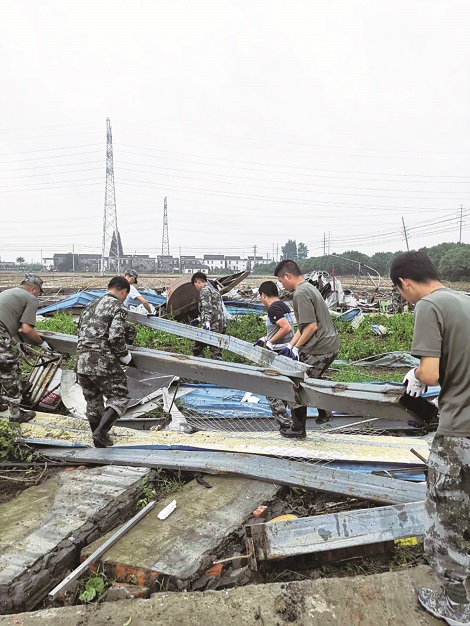 在受灾最严重的勤王村晓岸家庭农场,民兵应急分队队员凌吉一边帮西瓜种植户王晓军清理钢架大棚,一边告诉记者,昨天接到区人武部命令后,他便和村里其他两名同志从保丰村赶来了,在区人武部统一指挥下,帮助王晓军家清理了近30个钢架大棚,清运了大量西瓜,为养殖大户戴洪联重新搭建了养殖大棚,让20000万只肉鸡有了安身之处,最大限度帮助他们减少龙卷风造成的损失。