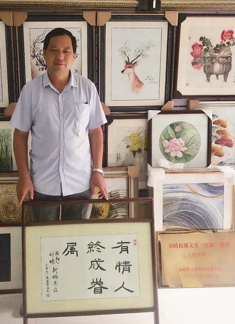 交谈中,记者了解到,杜贞林原是我市造纸厂的一名工人,后因企业关闭而下岗。杜贞林爱好书法、美术,在国画方面颇有造诣,曾拜师于著名装裱师,学成后开始创业,以装裱字画为生,曾被评为“高邮市优秀创业者”。而当“红娘”则源于他对爱的回馈。
