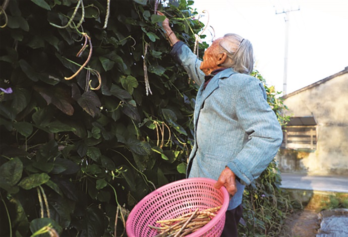 采访中,笔者看到她真是闲不住。这不,刚洗完衣服,她又忙着用连枷(农具)不停地敲打摊铺在家门口水泥地上黄豆秸。忙碌了一阵子,老太又接着用小簸箕盛稻谷喂圈养的鸡,再到家门口菜地上忙着摘菜……真让人难以相信,面前的这位老太已届百岁高龄。