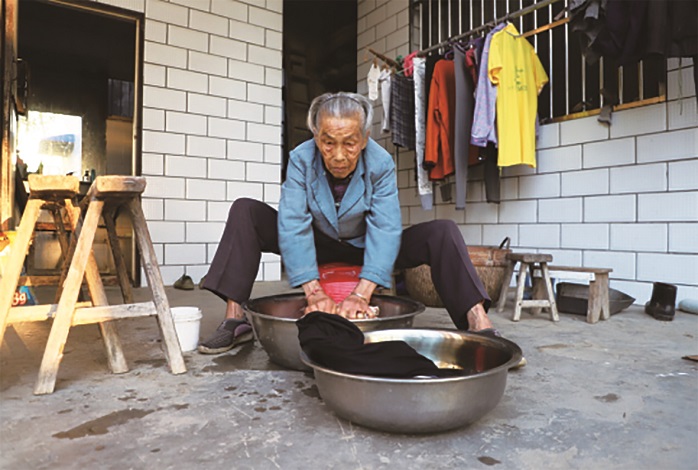9月29日一大早,笔者来到袁风英老太家采访时,只见她正坐在门口小板凳上,弯腰用搓衣板“呼哧、呼哧”地洗着衣服。