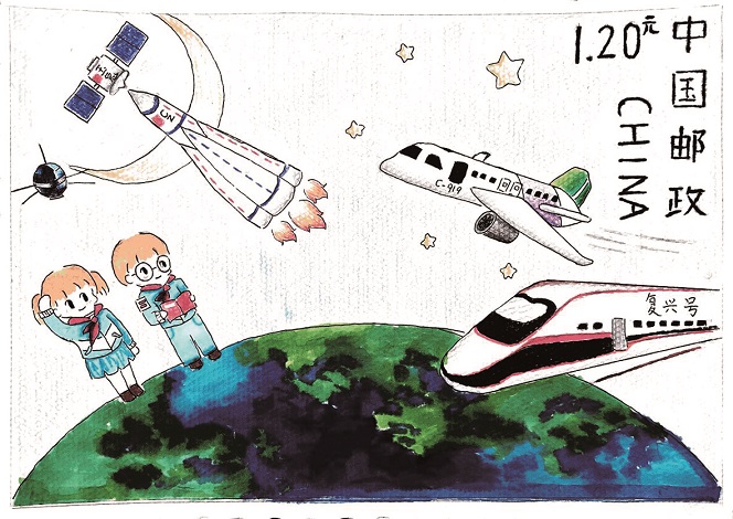 学生们通过观看视频、图片,了解邮票的要素,激发创作热情。孩子们脑洞大开,精心构思,作品童趣幽默,用自己独特的视角表达对祖国的热爱、对家乡的赞美。南海中学共征集作品100多幅,经过班级初选、年级评选,最终选出8幅作品参赛。实验小学选出11幅作品参赛。2月21日,19幅作品的手画稿和电子稿、登记表报送到高邮市集邮协会,市集邮协会及时报送到扬州市集邮协会。3月2日,省邮协秘书处组织评审小组成员对作品进行了评审,南海中学七(2)班俞雪婷同学的作品《复兴号》,选取了具有代表中国高速发展的高铁、航天飞机作为邮票图案,整个画面色彩搭配协调,荣获全省设计大赛二等奖。市实验小学四(2)班陈菲的作品《弄潮 高铁 航天》,用飘扬的党旗、雄伟的长城、快速发展的城市、飞速前进的高铁、精神焕发的少先队员,构成了一幅充满童趣的画作,荣获全省三等奖。另外南海中学七(8)班张刘雨心,实验小学二(7)班吴桐羽、四(1)班陈王嘉、一(4)班夏澄茜的作品获得纪念奖。3月18日,全国集邮联合会网站发表了南海中学俞雪婷同学和指导老师翁莲香的创作随想。