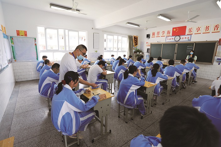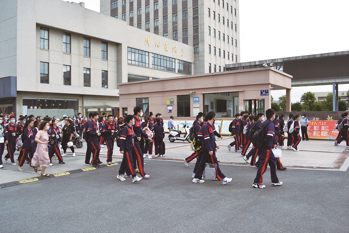 “早饭吃了没有?体温量一下,朝中间门走……”中考首日,在南海中学考点,该校校长早早地来到学校门口,引导考生有序进入考场。记者注意到,该校校长身穿红色旗袍,学校老师均穿上红色衣服,为考生加油鼓劲。该校门口还竖起了各色彩旗、架起“全力以赴 共创辉煌”字样的拱门,电子显示屏还打着“沉着应试,超越自我”的标语……共同营造为学生加油的氛围。