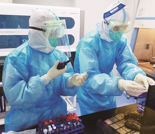 因为核酸检测过程是全程封闭式,李勇只好在实验室门外接受记者采访。目前,核酸检测实验室内共有4套检测仪器,每日最大检测量为2100管。样本采集完成后,将第一时间被转运到实验室,由检测人员进行核收及录入。“在这个环节里,我们的检测人员将对核酸样本进行手工加样,这不但是个精细活,更是检测过程中风险最大的环节。”李勇说,尽管这份工作存在一定风险,但他的团队里没有一人退缩,没有一人喊苦喊累。