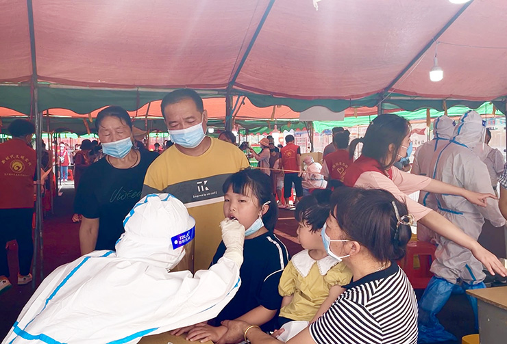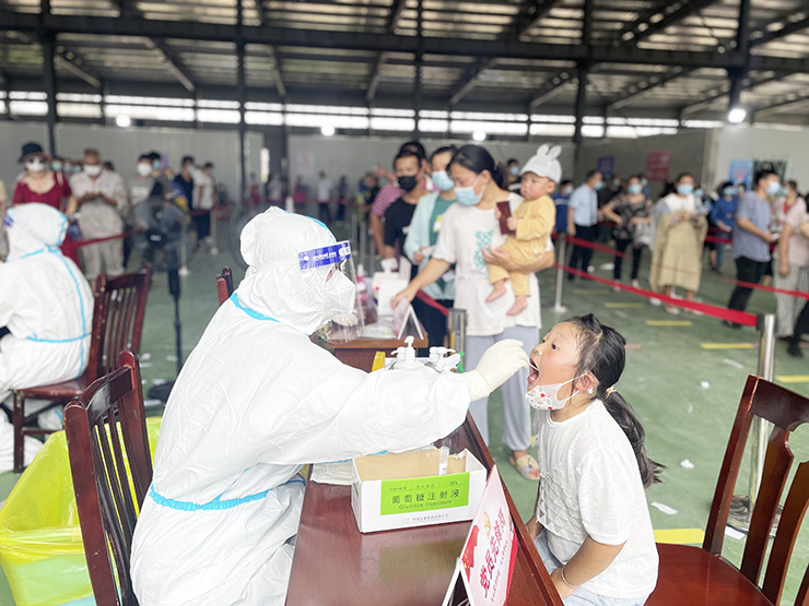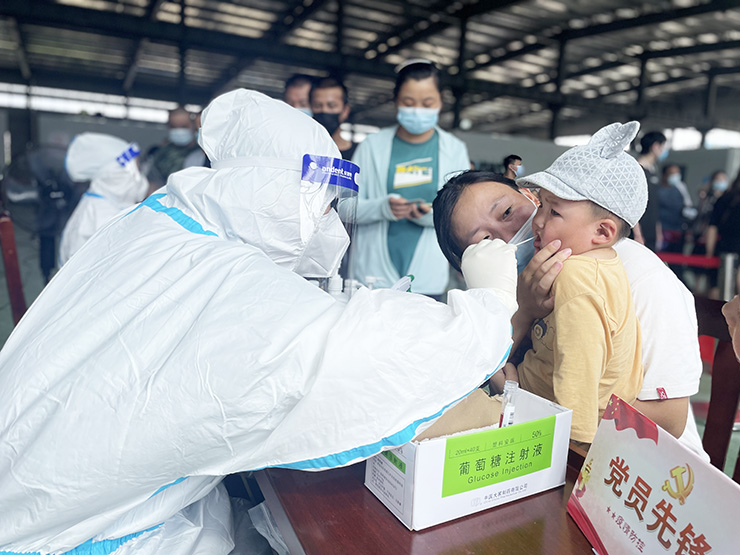 “宝宝,把嘴巴张开,张大一点!”在城南新村浩芝村、管伙村、蚕种站联合采样点,村民袁玲正配合着医务人员为怀中着9个月大的儿子做核酸检测。由于孩子太小一直不太配合,袁玲便用手掰开儿子的嘴巴,方便医护人员采样。“我知道疫情防控形势比较严峻,虽然担心孩子太小不配合,但还是带孩子来检测。现场工作人员都很不容易,我们不能搞特殊、添麻烦,要全力配合检测工作。”袁玲说完后,抱着哭闹的儿子,搀着刚做完核酸检测的大女儿有序离开现场。