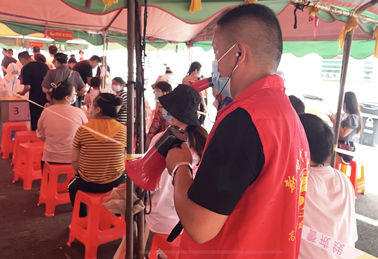上午10时许,在城南新村浩芝村、管伙村、蚕种站联合采样点,记者见到浩芝村志愿者吴荣清时,在烈日的照射下,忙碌的他满头大汗。尽管如此,他全然不顾,不停地提醒村民有序停放车辆。“我负责采样点周边的交通秩序。疫情面前,政府在为老百姓守护‘家园’,作为一名普通老百姓,参与抗疫,做些志愿服务理所应当。”吴荣清说。