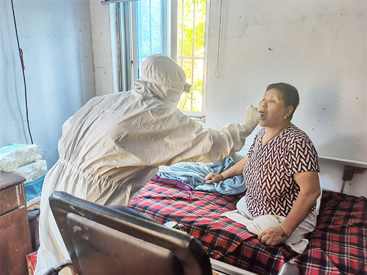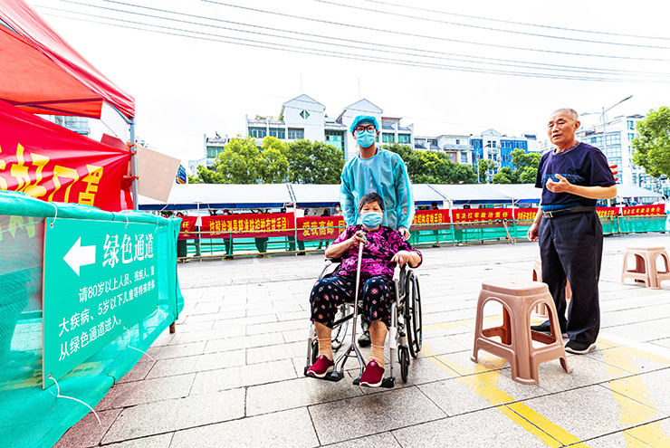 当日一大早,甘垛镇和平村104岁的高龄老人阮香子乘坐轮椅,在家人的陪同下来到村检测点。看到老人前来,志愿者立即上前为老人开通绿色通道,帮助她快速完成了核酸检测。陪同前来的老人女婿高春华告诉记者,核酸检测既是支持政府工作,也是对自己负责,而且还是免费的,必须要把老人带来做核酸检测,原本担心老人岁数大,排队时间长难坚持,没想到政府非常贴心,为特殊人群设置绿色通道,几分钟就做完了核酸检测。