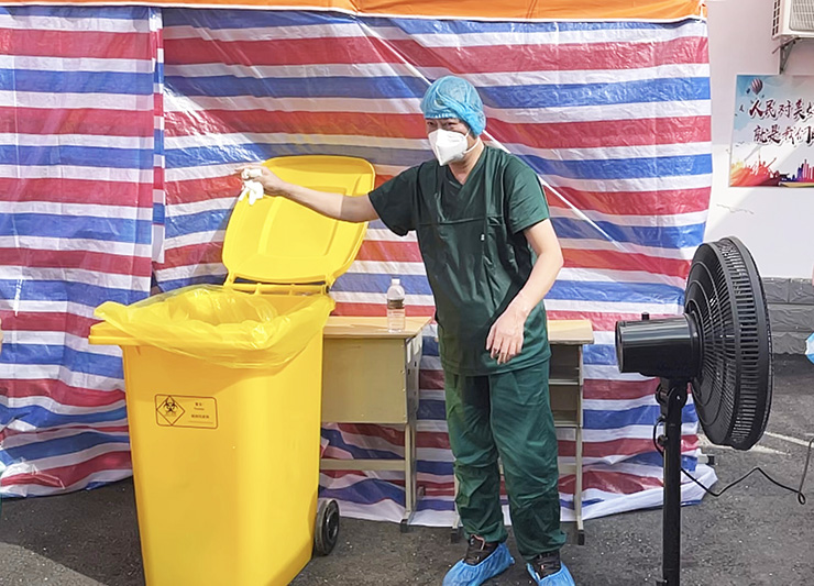 9时许,在高邮镇黄渡社区核酸检测采样点,来自南通市崇川区卫生系统的张佳丽与来自我市中医院的夏小萍忙碌了数小时后,脱下战袍进行短暂休息。炎热的天气、厚重的防护服、长时间的工作,张佳丽与夏小萍已汗流浃背,她们与其他医务人员一样,成为这场战“役”路上最亮丽的一道风景线。