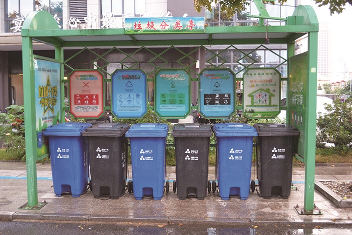 金桥路鹅村长饭店门口垃圾分类亭里的垃圾桶干净整洁、摆放整齐。