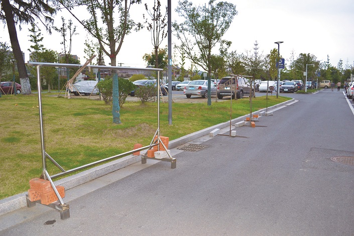 半边桥附近公共停车场居民随意摆放晾衣架。