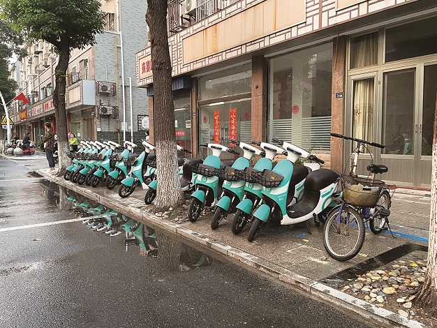 市水利局对面共享电单车与市民自行车摆放整齐。