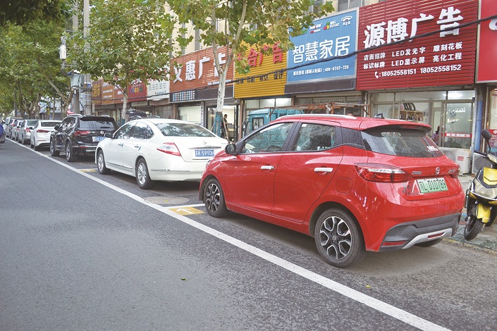 通湖路段人民公园北门往西路段公共停车位机动车停放整齐。