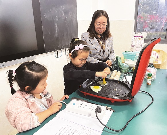 13日下午5时许,记者走进高邮实验小学东校区,只见学校操场上热闹非凡,打篮球的、踢足球的、玩轮滑的应有尽有,不时传来阵阵欢声笑语。走进该校活动教室,阵阵香味扑鼻而来,只见该校一年级的24名学生正在授课老师常虹的指导下制作蔬菜饼。学生们有模有样地敲鸡蛋、切蔬菜,搅拌均匀后放入电饼铛中。刚做好,孩子们便迫不及待地将煎好的蔬菜饼端至位置,津津有味地品尝起来,脸上露出开心的笑容。“我觉得学做饭是件非常有意思的事,学会以后可以做给爸爸妈妈吃。”一年级学生吴沐然自豪地向记者展示她制作的蔬菜饼。