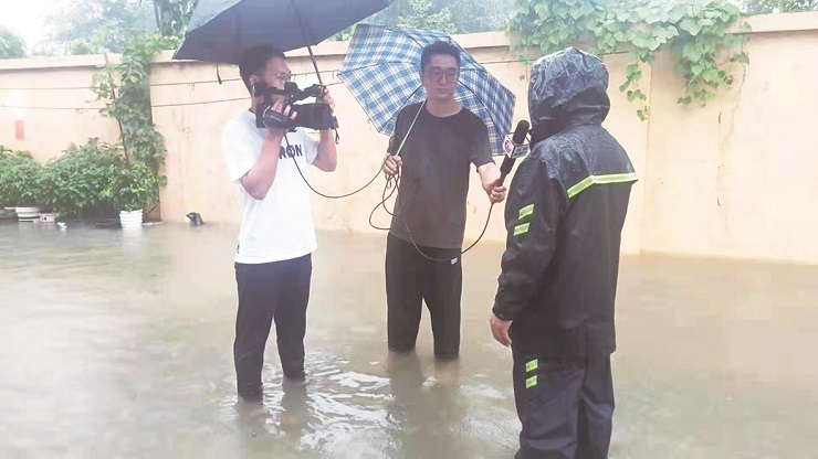 暴雨中,他扛着摄像机,她举着话筒,卷起裤脚,任凭风吹雨打,他们站在及膝高的雨水中报道“烟花”来袭全市抢排积水的情况……