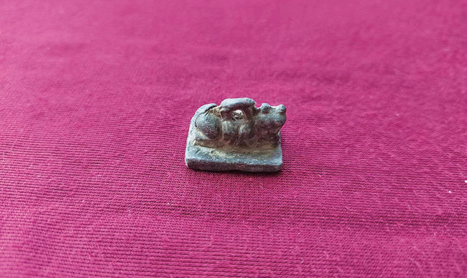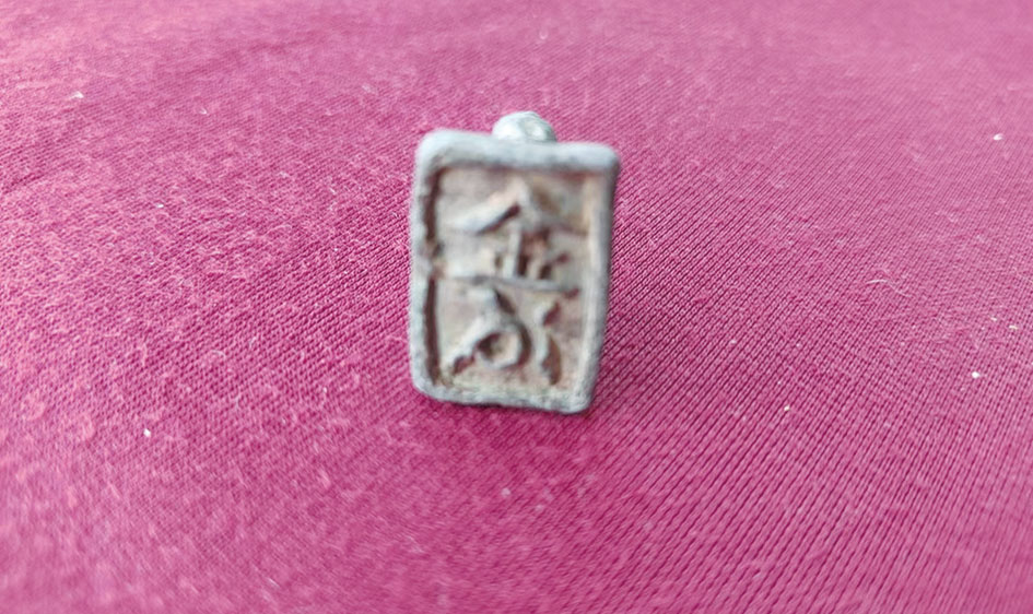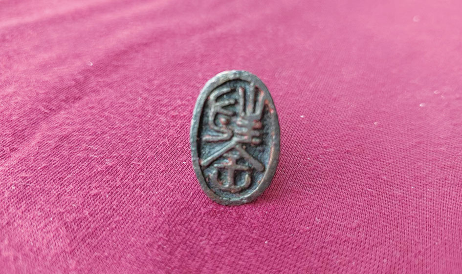 田步迎先生收藏的第二方印章是一种押印,为“金(押)”印。铅质,长方形,长2.1厘米,宽1.5厘米,厚1.2厘米,重16克,上面有虎形钮。也是1985年随“高邮铁钱”一起出土的。