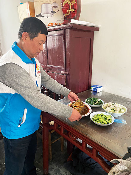 6年来的真情相伴,红星志愿者和4户困难家庭相处得像“亲人”一般。在王展农家,记者看见,“幸福星期六”项目组负责人邵建新蹲下身子为久卧在床的王展农修脚,志愿者徐萍先后为王展农夫妇理发,一同前来的志愿者谈桂娣、桂红也没闲着,扫地拖地、拣菜做饭,他们在忙碌的同时,还不忘和王展农夫妇聊天,说说家长里短、聊聊身边故事。说笑声中,青菜肉圆汤、红烧鱼、炝黄瓜、韭菜炒百叶,两荤两素,四菜一汤搬上了饭桌,屋内饭菜飘香。看着热气腾腾的饭菜、说起志愿者多年来的帮助,面带笑容的王展农汤平珍夫妇感动不已。“自打瘫痪在床后,虽然家里没有了经济来源,但在政府帮扶政策下,一家人吃穿不愁。”王展农感言,6年来,红星志愿者一次又一次地来家里,生活中有困难都会帮忙解决,还不时地送衣送物,每次生病需要住院,他们也都忙上忙下,这么多年,幸亏有他们。