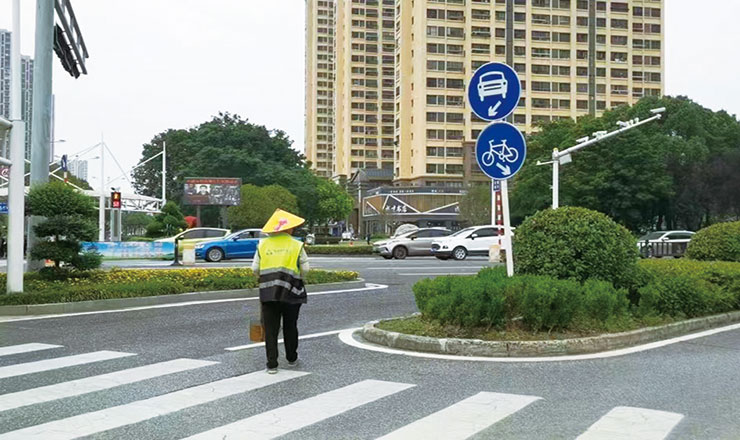 负责通湖大桥附近区域保洁的环卫工人在捡拾垃圾,守护美好环境。