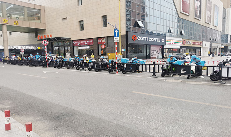 世贸广场与世贸金街的交界处,一群外卖小哥正在等候取餐并确认订单,为消费者能够尽快拿到外卖而认真工作。