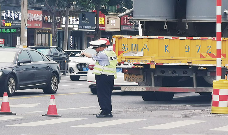 屏淮路的十字路口,交警正维持着交通秩序,协调人车通行,为市民安全出行保驾护航。