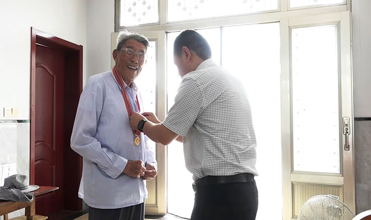 家住城南新区太丰村的抗美援朝老兵金加椿今年91岁,得知当地退役军人服务站的同志要来看望他,特地戴上他视若珍宝的纪念章,坐在门口静静等待。清晨的阳光透过茂密的枝叶,浅浅地照射下来,老人连同他胸前的那枚纪念章一起闪闪发光。