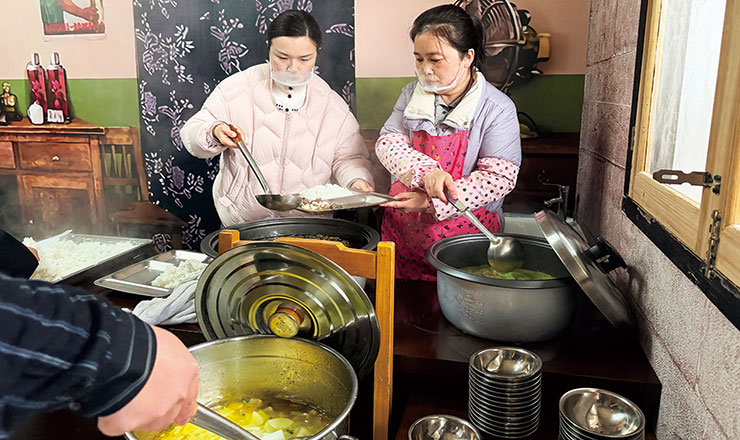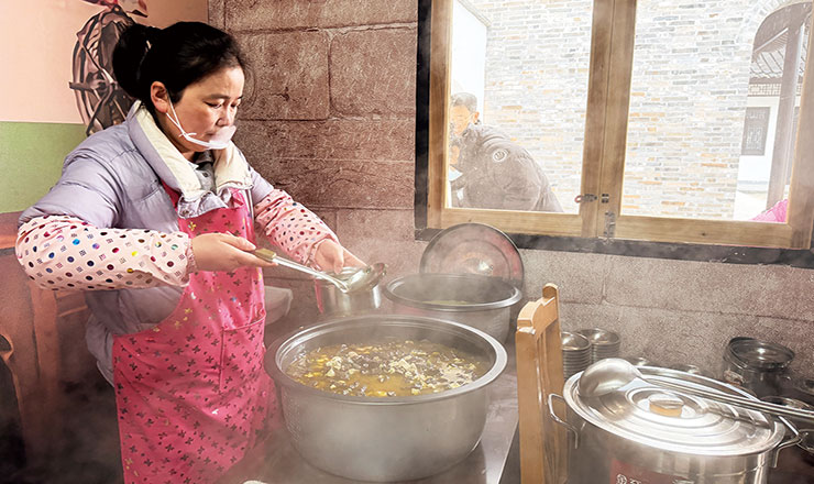 “开饭咯。”1月29日中午11时许,“幸福大食堂”准时开餐。刚出锅的菜肴伴随着香气被端了出来,前来就餐的村民们等候在餐厅外,三三两两地聊着家常,眉眼里满是笑意。“爷爷奶奶你们先坐下休息,饭菜马上就到。”清真村党委书记杨梦雪一边热情招呼着,一边和同事们麻利地盛饭菜,食堂里顿时热闹起来。