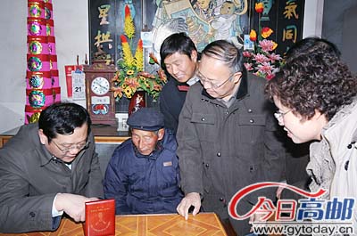 市领导夏正祥、吴平权、徐永宝、赵谈理等分别来到临泽镇、界首镇老党员王永中、低保户居而贵等群众家中走访慰问。在临泽镇临西村村部,夏正祥等把慰问金、慰问品送到优抚对象袁福才、残困户赵兰英、低保户顾锦恒等手中,并祝他们身体健康,家庭幸福,新年快乐。优抚对象袁福才连声说:“感谢共产党、感谢政府!”在临泽镇敬老院,夏正祥一行给老人们送上慰问金及慰问品,老人们激动不已,一个劲地鼓掌感谢。在敬老院宿舍,夏正祥用手摸摸老人床上的垫被,关切地对敬老院院长说:“天冷,不能让老人受冻!”当得知老人每人盖两床8斤的大棉被,房间里有卫生间时,夏正祥放心地点点头。敬老院院长还给夏正祥递上春节敬老院的节日菜谱,夏正祥详细询问了节日期间的伙食安排,满意地说:“刮刮叫!”并再三叮嘱镇里的干部,一定要把老人照顾好,让他们在敬老院安享晚年。
