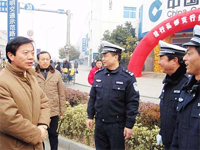 在农工商红绿灯岗亭,市领导向正在值班的交通警察们致以节日的祝福。夏正祥说,这几年高邮城市交通秩序明显变化、城市文明程度不断提升,这些成绩的取得离不开交警的努力。